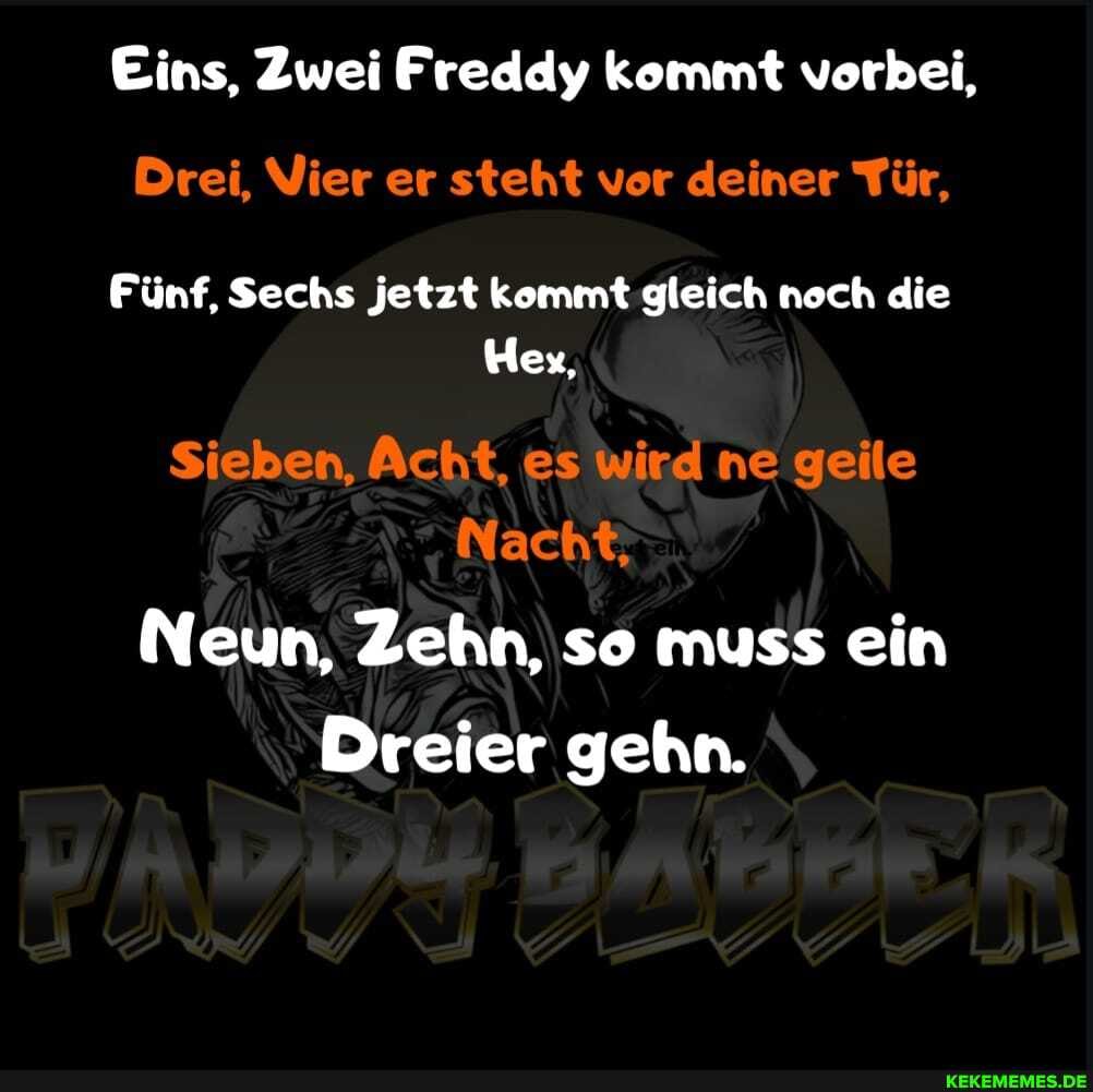 pokolersiz90210. 28.07.2010, 19:52. „Eins, zwei, Freddy kommt vorbei Drei, vier, verriegel deine Tür Fünf, sechs, nimm dein Kruzifix Sieben, acht, schlaf nicht ein bei Nacht Neun, zehn, du sollst nicht schlafen gehn!". Und WIKIPEDIA sagt zusätzlich noch: Abweichungen gibt es vor allem im dritten Vers, der immer wieder als „Fünf, sechs.