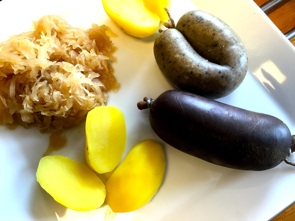 Blut und Leberwurst mit Kartoffeln und Sauerkraut Rezept kochbar.de