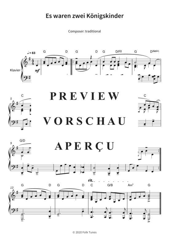 Es waren zwei Königskinder Klavier Solo PDF Noten von traditional in G Dur 4251133757798