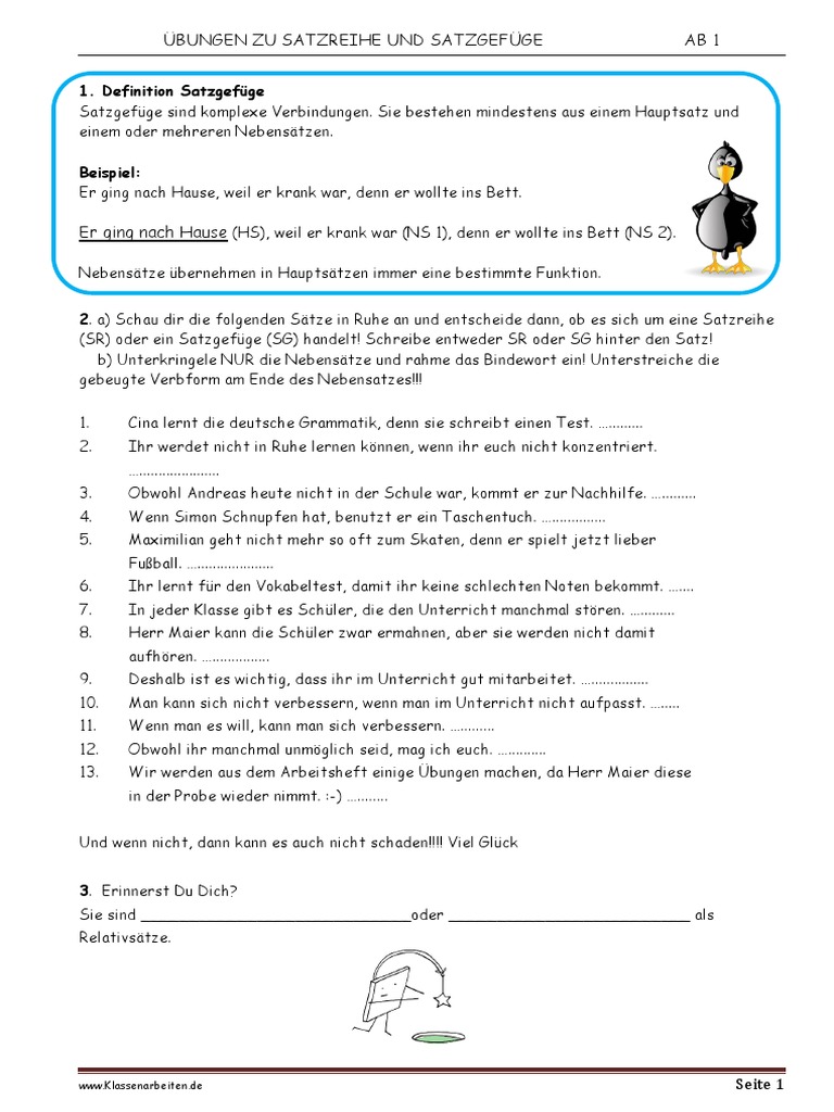 Übungen zu Satzreihen und Satzgefügen mit Lösungen. Übungen zu Satzreihen und Satzgefügen mit Lösungen sind eine wichtige Methode, um die Kenntnisse in der deutschen Grammatik zu vertiefen und zu festigen. Satzreihen sind eine Reihe von Sätzen, die durch Kommas oder Konjunktionen verbunden sind, während Satzgefüge aus einem Hauptsatz und einem oder mehreren Nebensätzen bestehen.