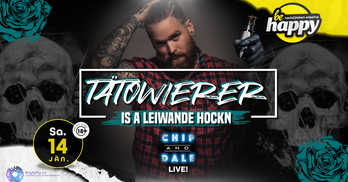 Samstag14.Jan. Samstag, 14. Januar 2023 von 21:00 bis 04:00. TÄTOWIERER - is a leiwaunde Hockn / Chip & Dale live! | SA 14.01. Tätowierer is a leiwaunde Hokn, da vadienst di depad, vadienst di depad Tätowierer is a leiwaunde Hokn, ja da kummst ins Göd, ja da kummst ins Göd…. Ja daun wiad a, ja daun wiad a, ja daun wiiaaaaada - a.