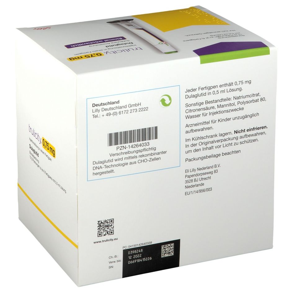 Trulicity 0,75 mg Injektionslösung Jeder Fertigpen enthält 0,75 mg Dulaglutid* in 0,5 ml Lösung. Trulicity 1,5 mg Injektionslösung. Es gibt nur sehr begrenzte Erfahrungen bei Patienten mit einer terminalen Niereninsuffi-zienz (< 15 ml/min/1,73 m2). Die Anwen-